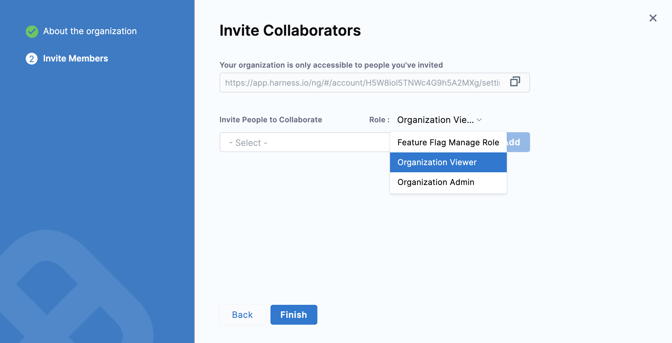 In Role, select the role the member will have in this org, such as Organization Admin or Organization Member.