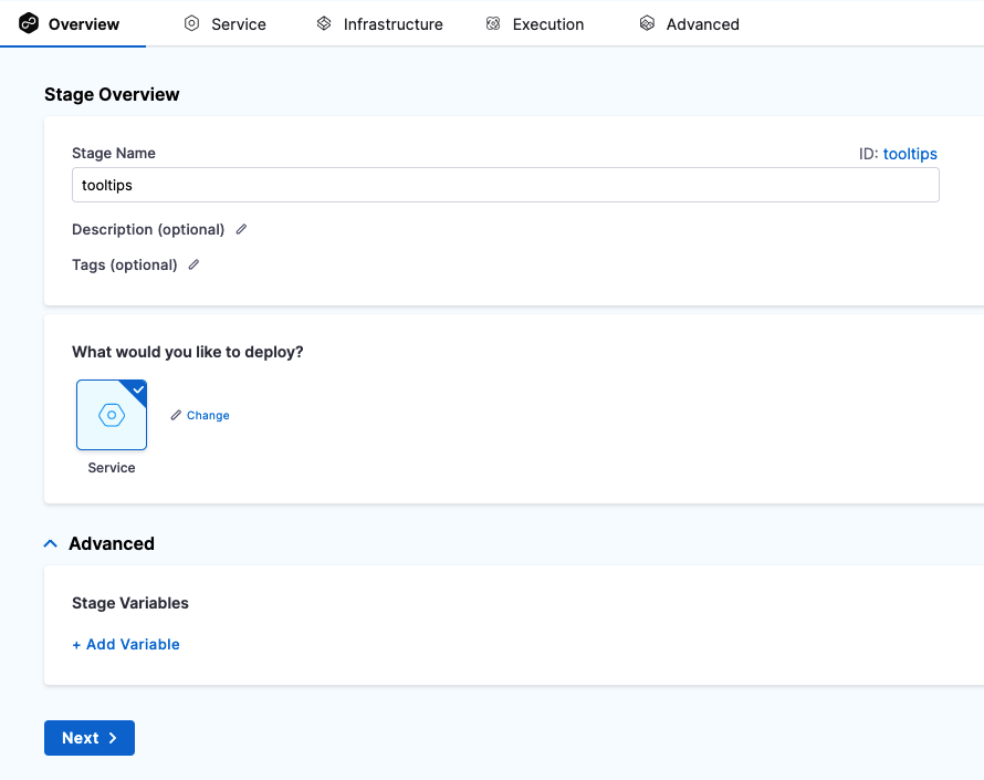 - You must provide a few initial settings to add a stage to a pipeline, and then you can configure additional settings, such as Infrastructure or Stage Variables after adding the stage.
