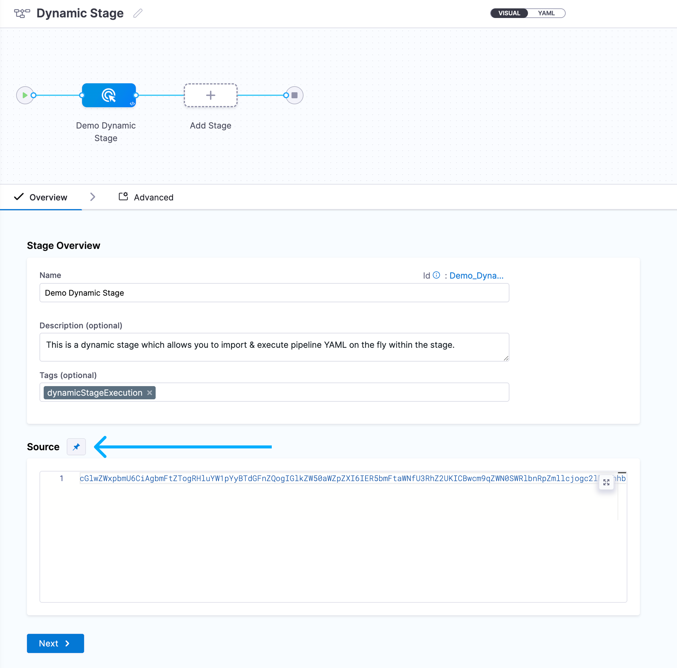 - Dynamic Stage: Dynamic Stage allows you to import pipeline YAMLs within a stage. These YAMLs can either be generated and transformed at runtime or be directly passed to the input source field of the dynamic stage in encoded form.