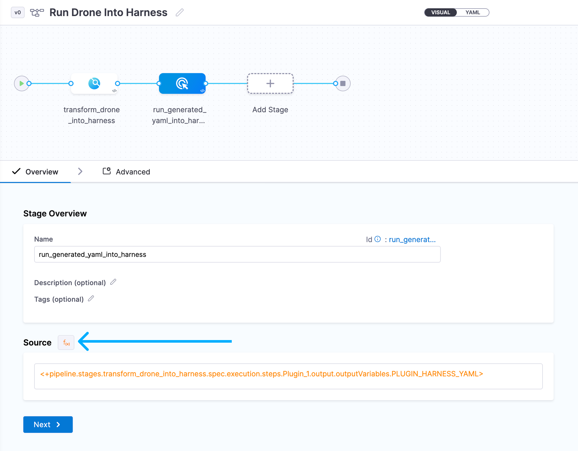 The following example demonstrates a pipeline in which a Drone pipeline is converted into a Harness pipeline through a plugin, and the encoded Harness pipeline YAML is passed to the Dynamic Stage through an expression containing the output variable belonging to the stage prior to the Dynamic Stage. This output variable stores the encoded pipeline YAML and, hence, serves as the source for the Dynamic Stage.