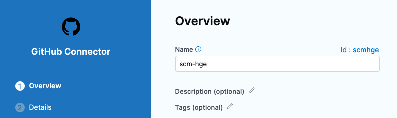 Entities and Resources in Harness have names and Ids (entity Identifier). For example, here's a GitHub Connector with the name scm-hge and the Id scmhge: