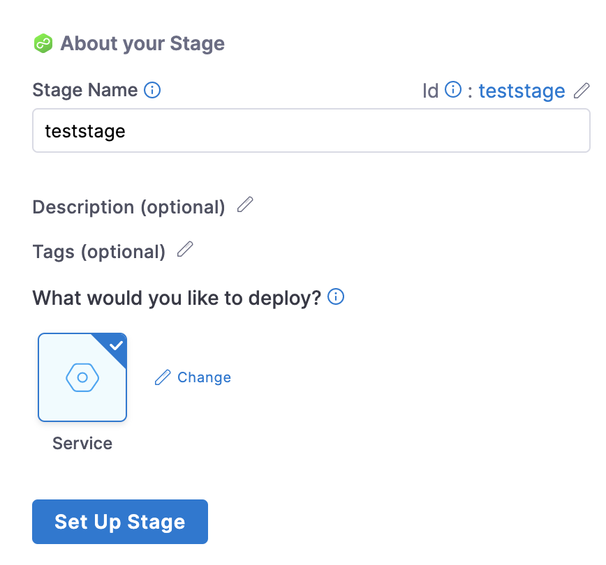 This example uses the Deploy stage. The Deploy stage type is a CD stage that enables you to deploy any service to your target environment.