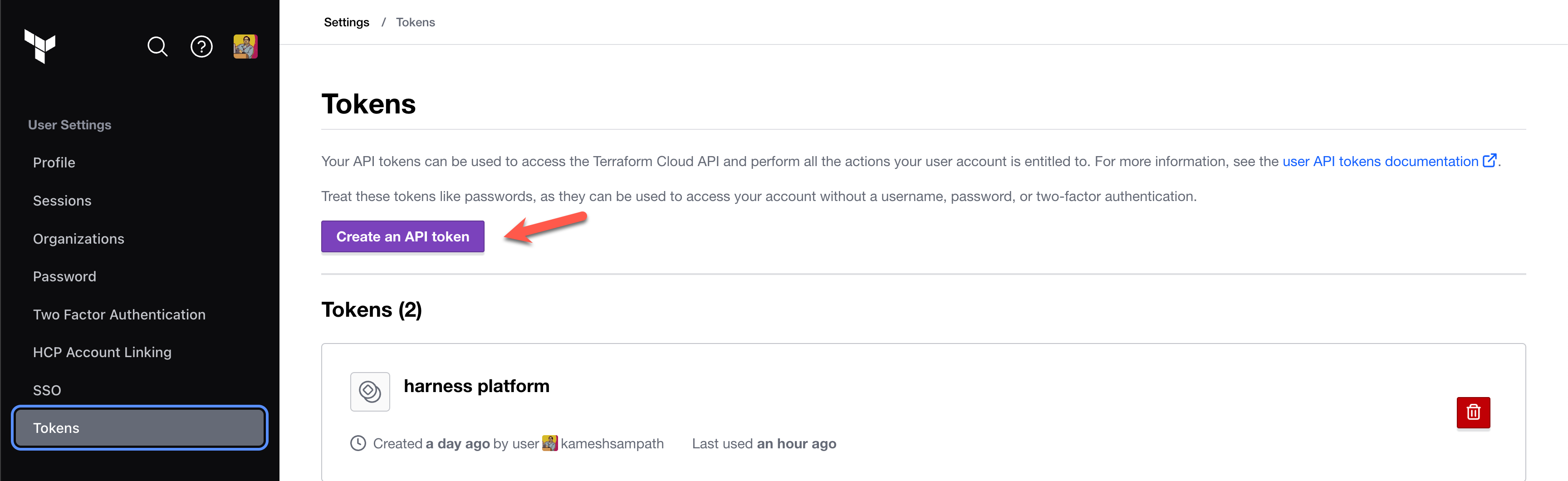 In your Terraform Cloud user settings, Create an API token. This token is used to pull outputs from Terraform runs.