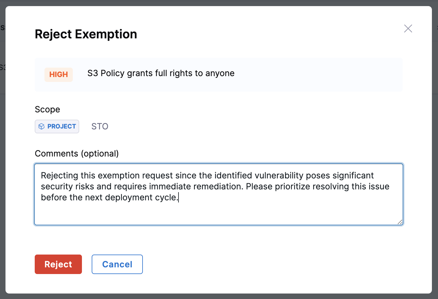 Each exemption request is associated with a specific scope, either a Pipeline, Target, or Project. Reviewers can approve the exemption at the requested scope or at a broader level, such as Organization or Account, as long as they have the appropriate permissions. Refer to the Required permissions for issue exemptions for more details.