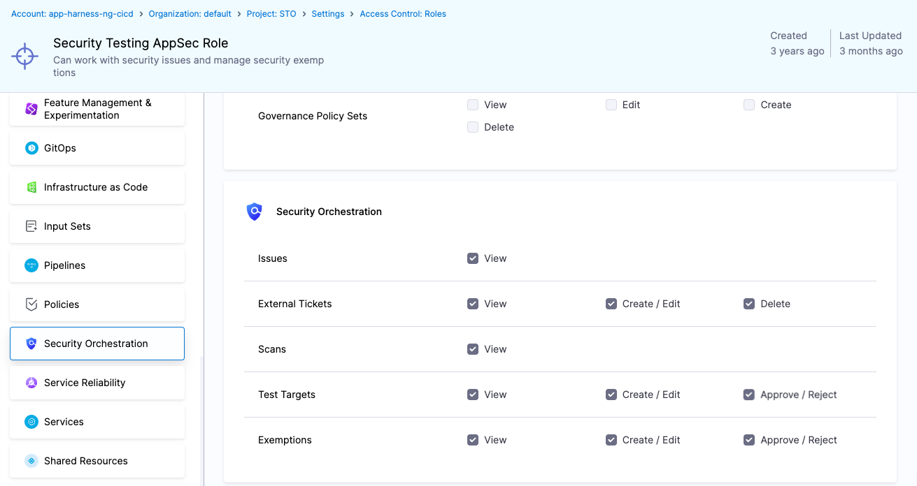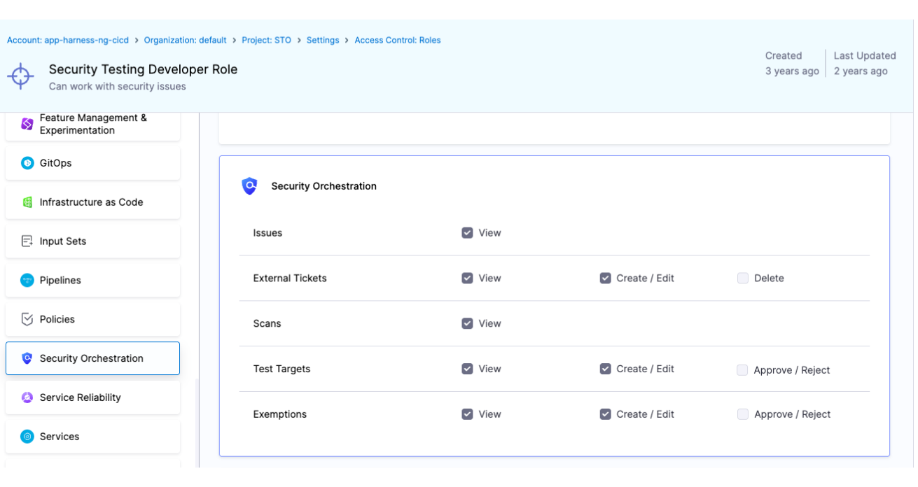 Harness includes two built-in roles specifically designed for STO use cases. Security Testing Developer and Security Testing AppSec. These roles come pre-configured with sets of permissions on STO resources to match typical developer and security team responsibilities.