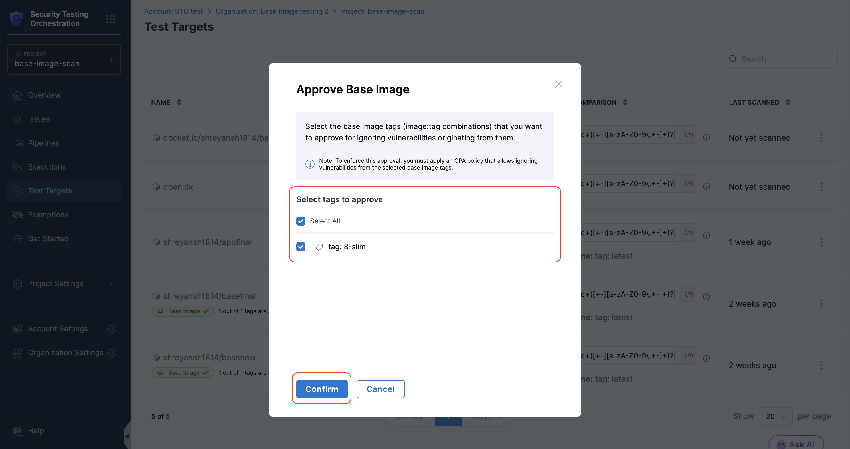 To unapprove a base image, you can follow the same steps and deselect the tags you want to unapprove and click Confirm. The approval or unapproval takes effect from the next pipeline execution.