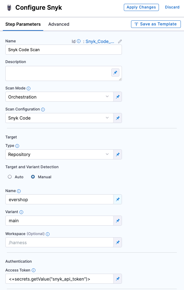 Refer to the Snyk step configuration document to learn more about the fields in the Snyk step and how to configure them.