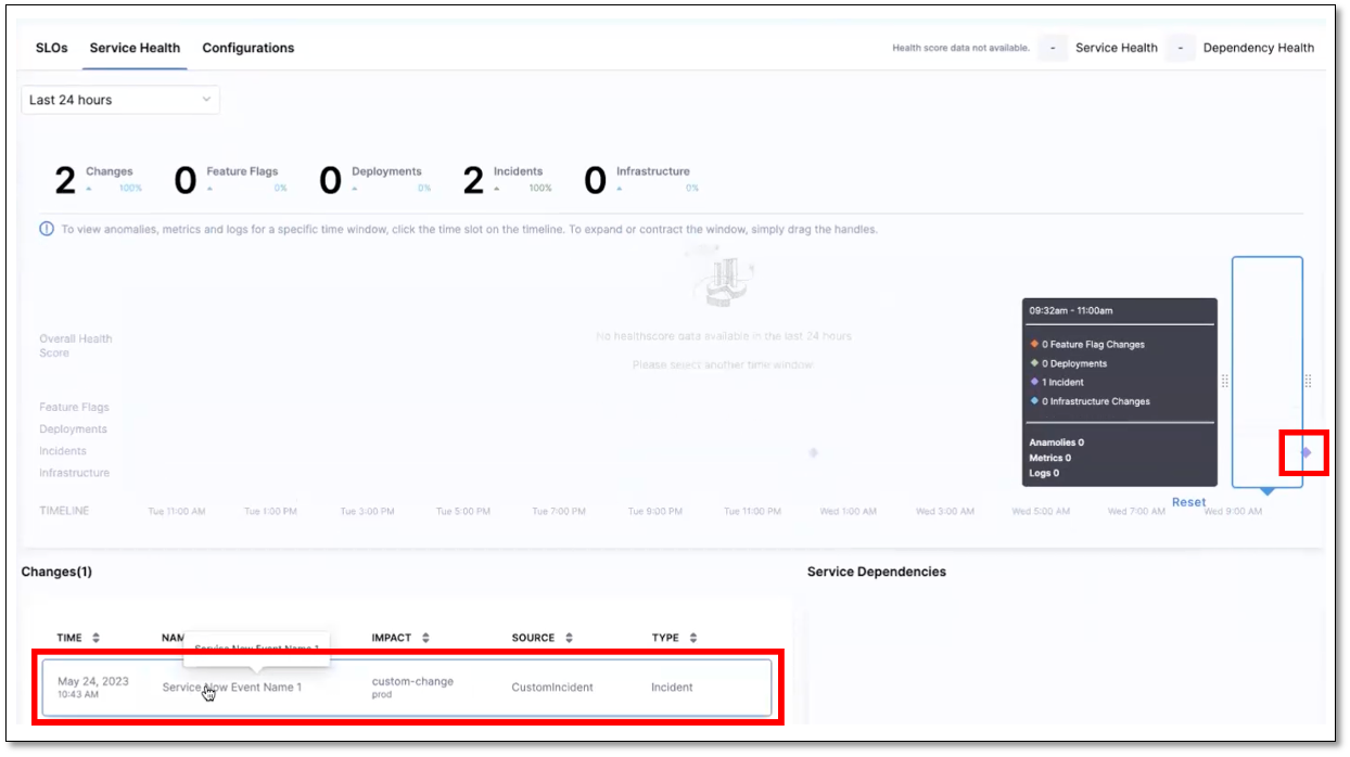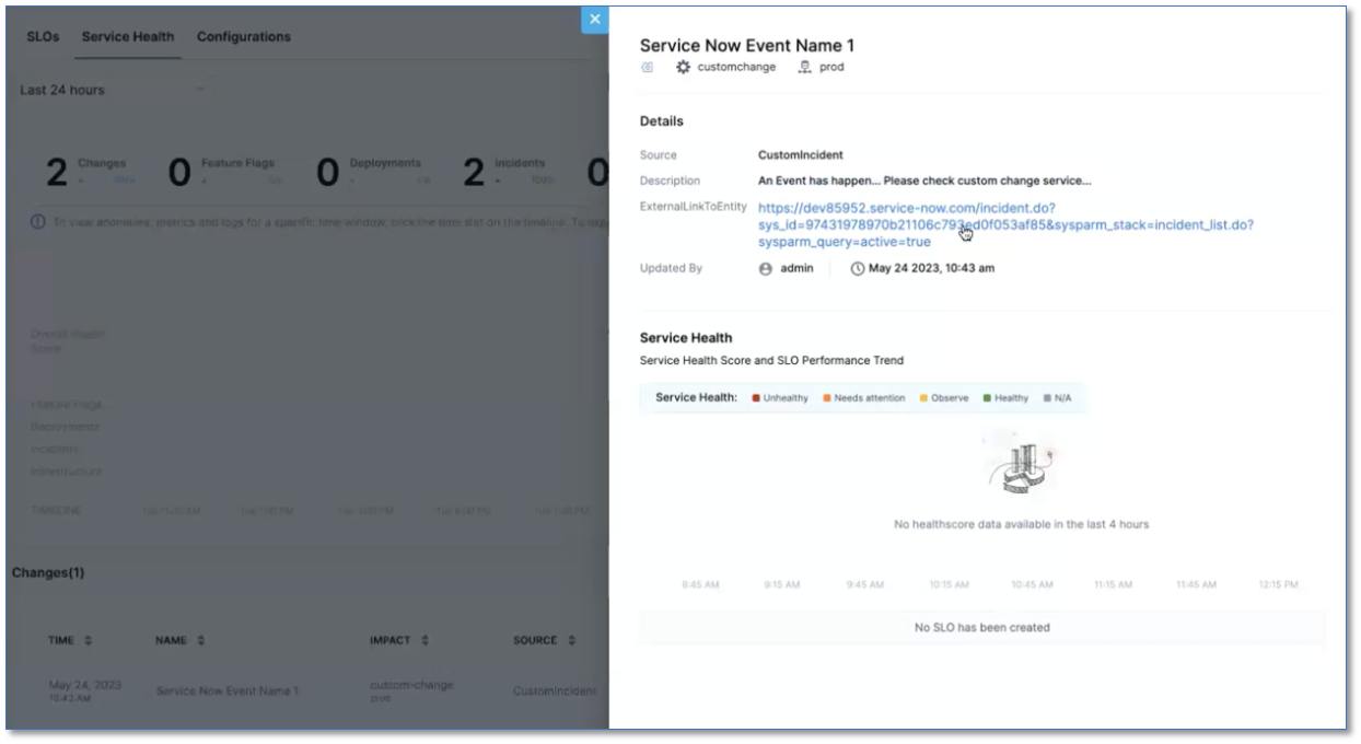 Select the monitored service for which you have configured ServiceNow as a custom change source.