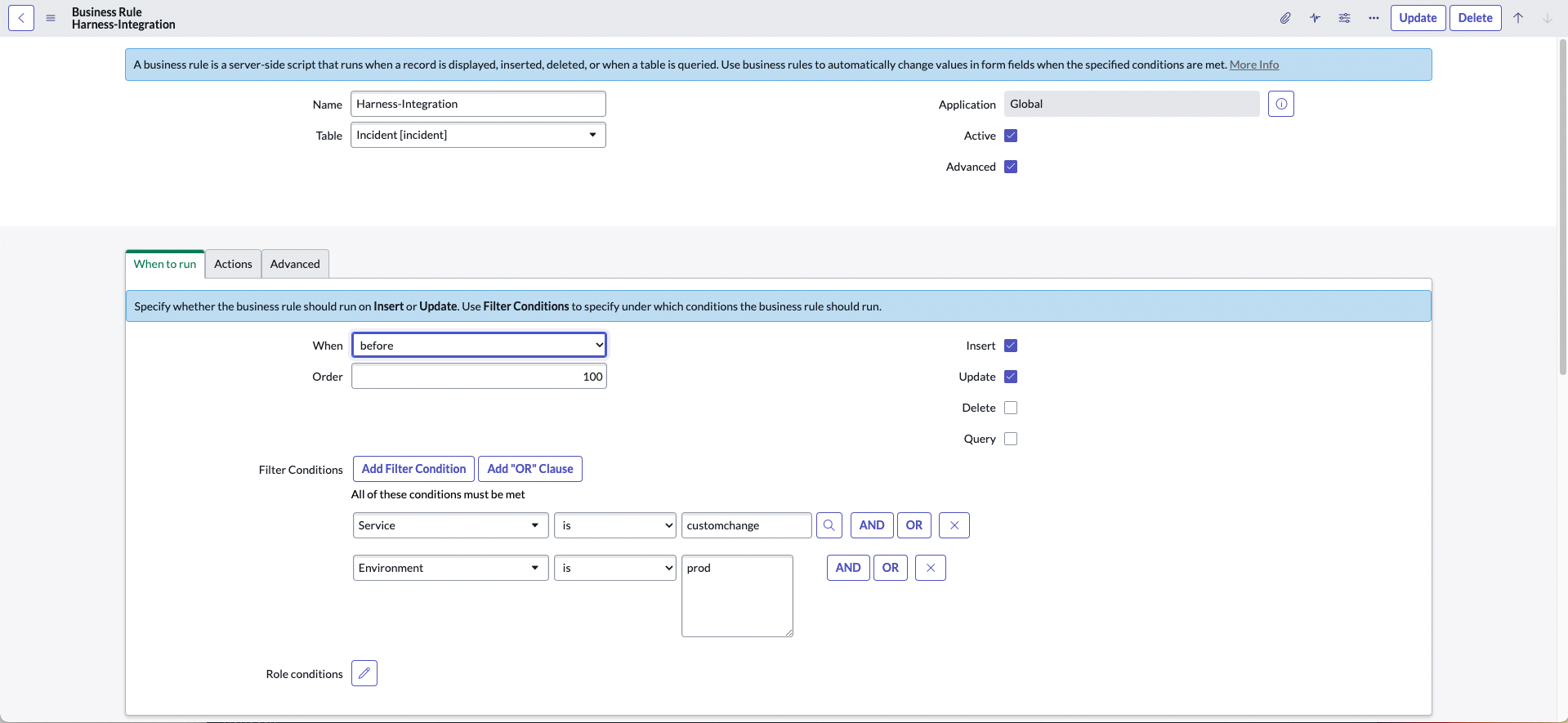 A business rule is essential to define trigger conditions and configure the Harness webhook in ServiceNow. Below are the steps to create a business rule that meets the requirements to use ServiceNow as a custom change source in Harness SRM.
