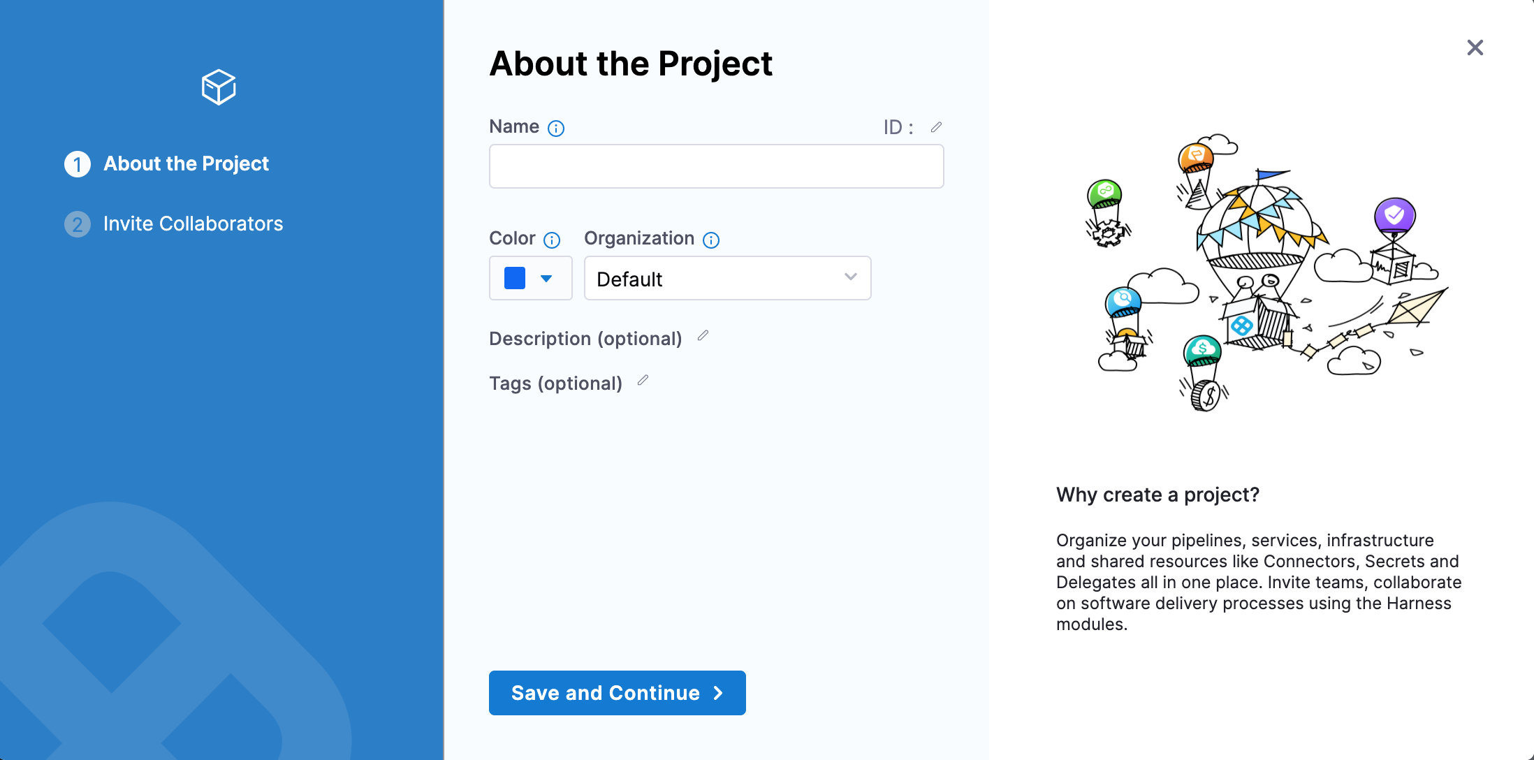 In Invite Collaborators, click Save and Continue. You will automatically be added as a Project Admin.