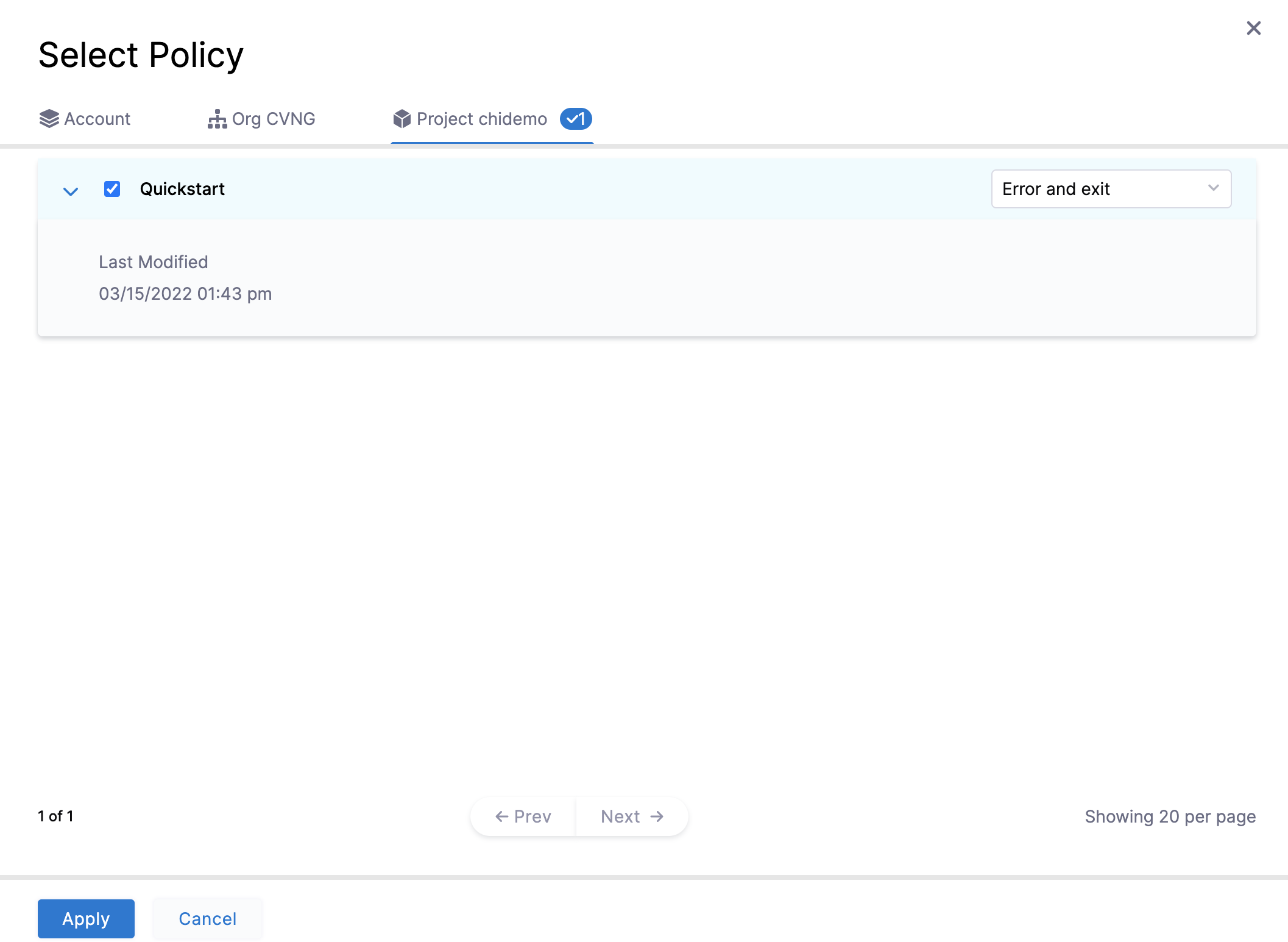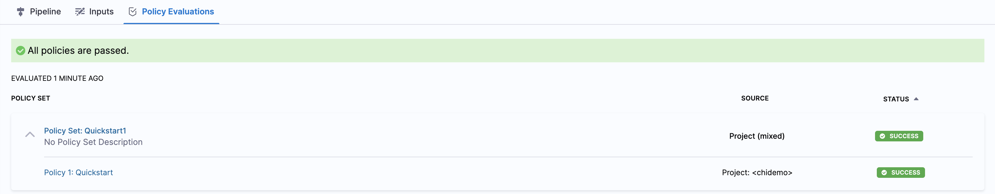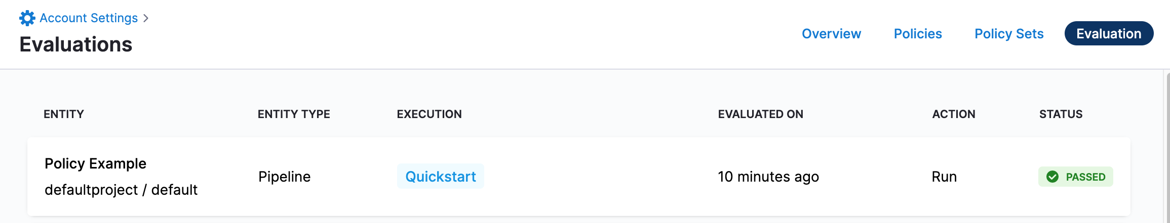 In Policy to Evaluate, select the Quickstart policy you created. Policies can be created at the Account, Org, and Project level.