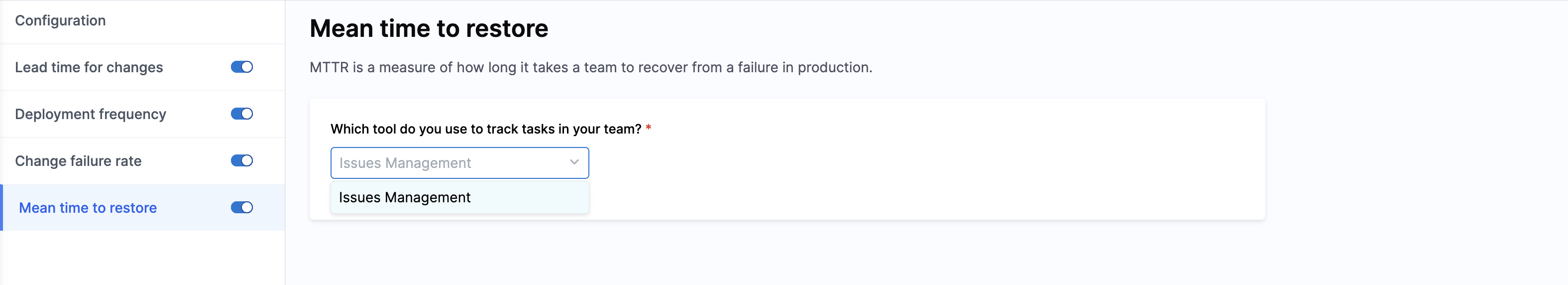 Mean Time to Restore (MTTR) measures the average time it takes for your teams to restore service after a failure or incident. This metric helps you understand how quickly your teams respond to and resolve production issues.