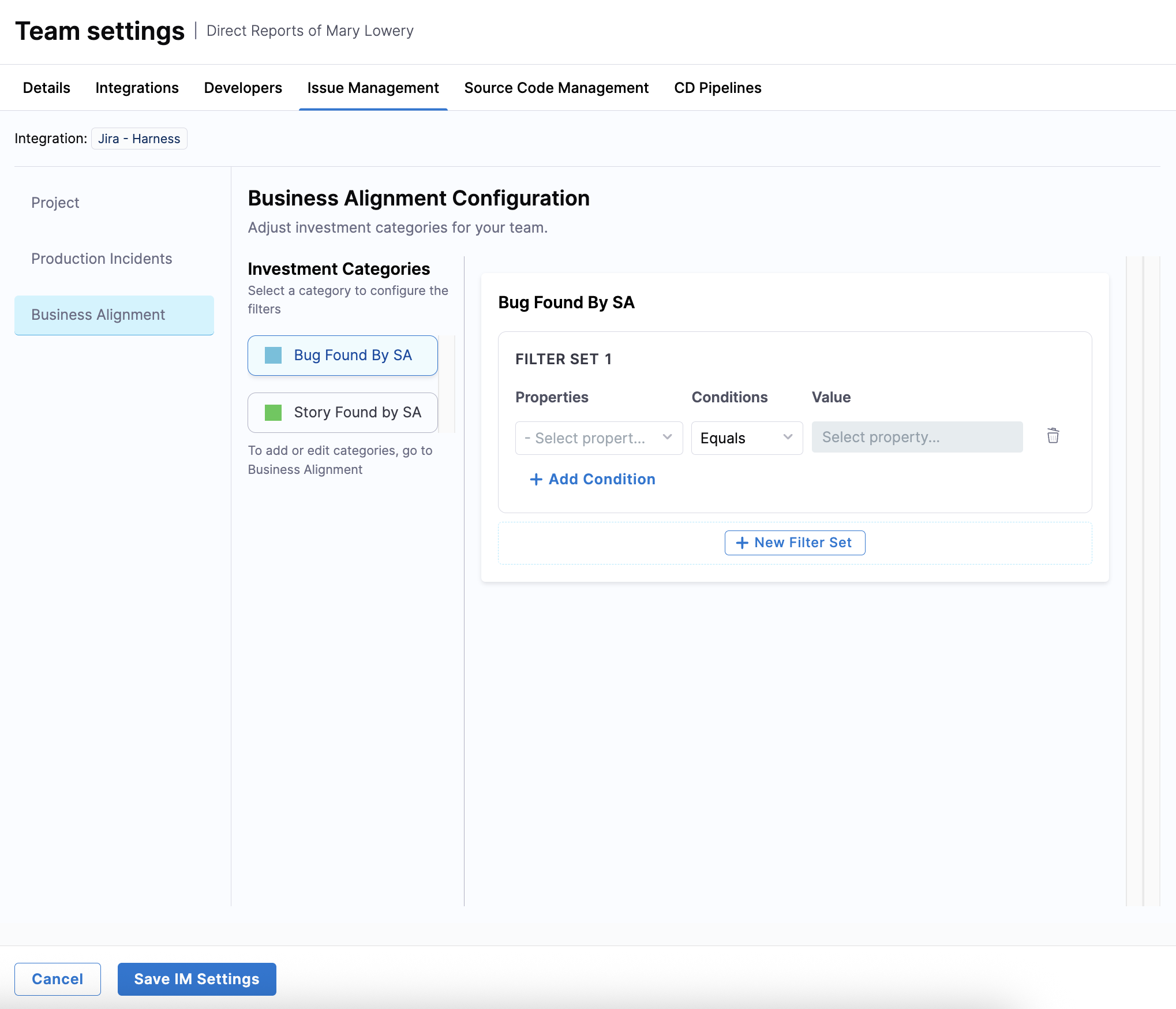 Create a filter set by adding conditions to define criteria for your team's issue management system on the Projects tab.