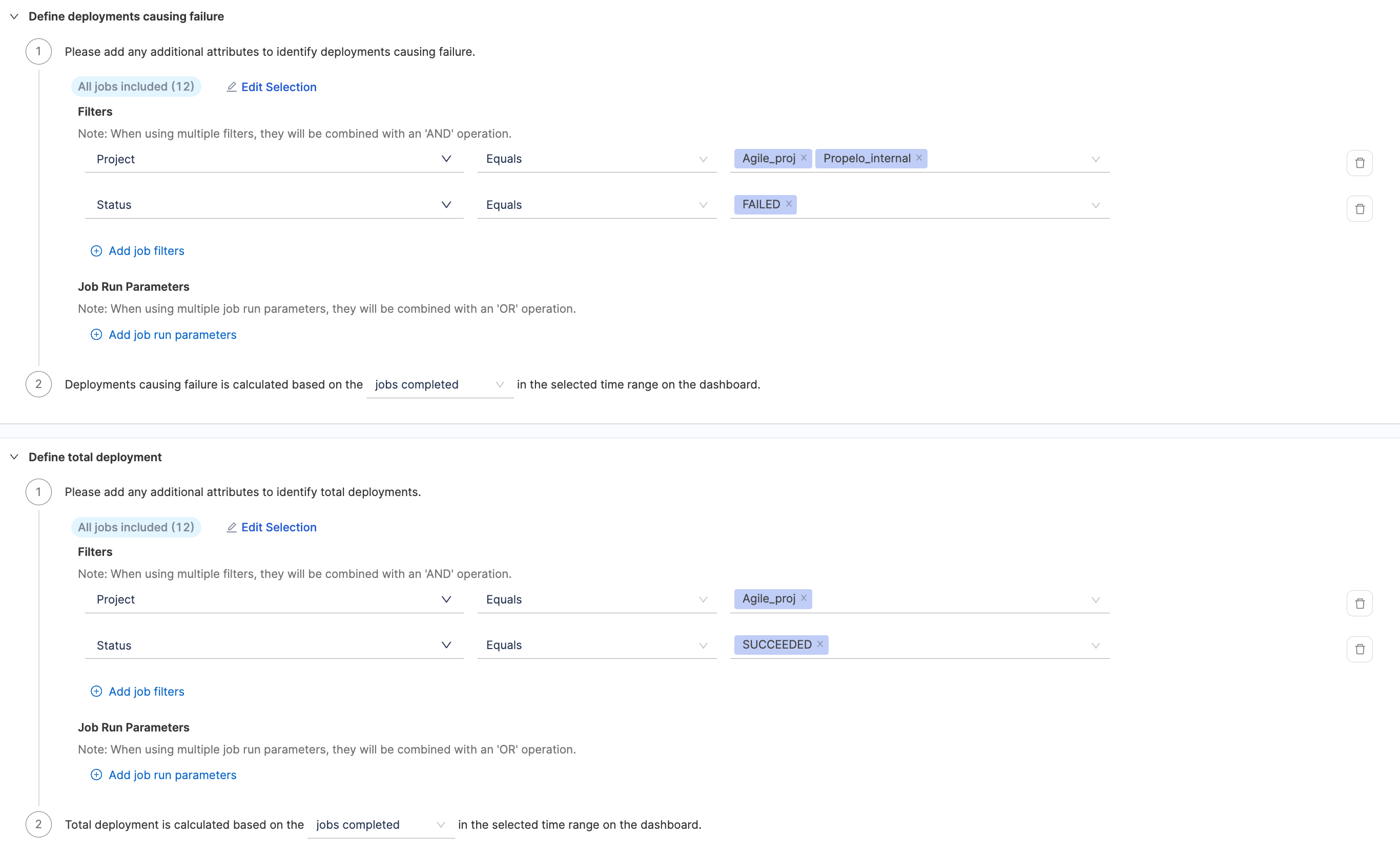 - Define job run parameters in key-value pairs. When using multiple job run parameters, they will be combined with an 'OR' operation. Similarly describe what defines a deployment causing failure based on the jobs completed or jobs started events in the selected time range.