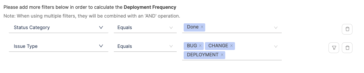- Configure additional attributes to define deployments that result in failure or total deployments. When applying multiple filters, they will be combined using an 'AND' operation. A failed Deployment can be a hotfix or a deployment that led to failure.