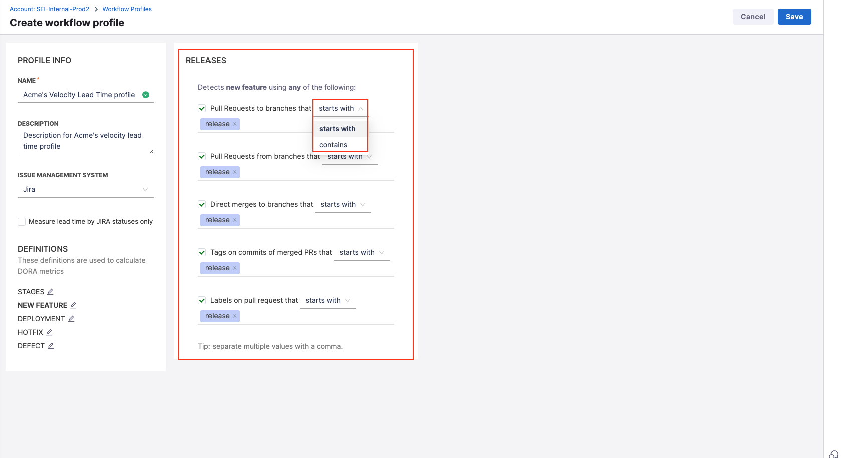 • For new profiles, the release stage is disabled by default. Enable it by selecting the checkbox to measure lead time using Jira statuses.