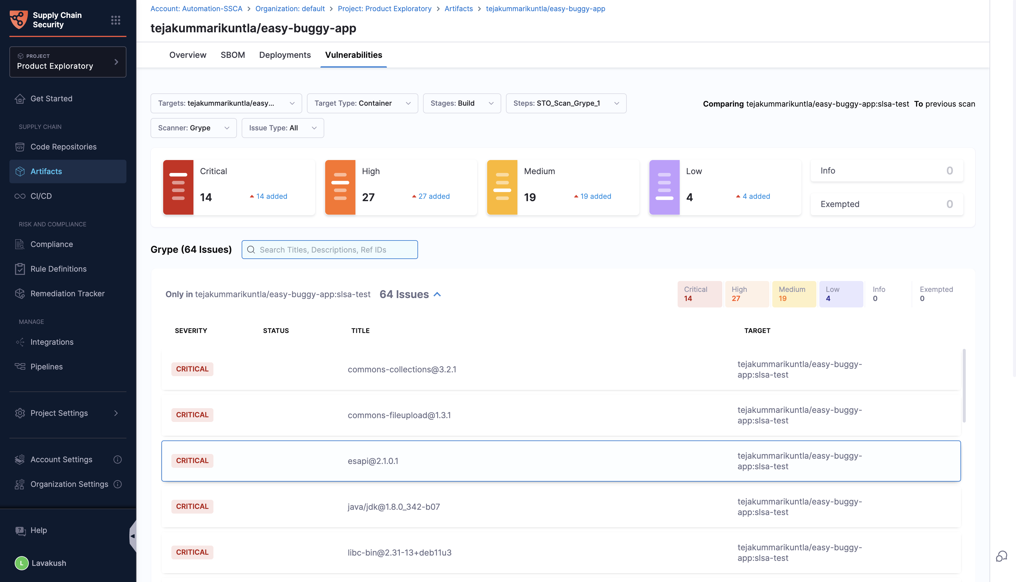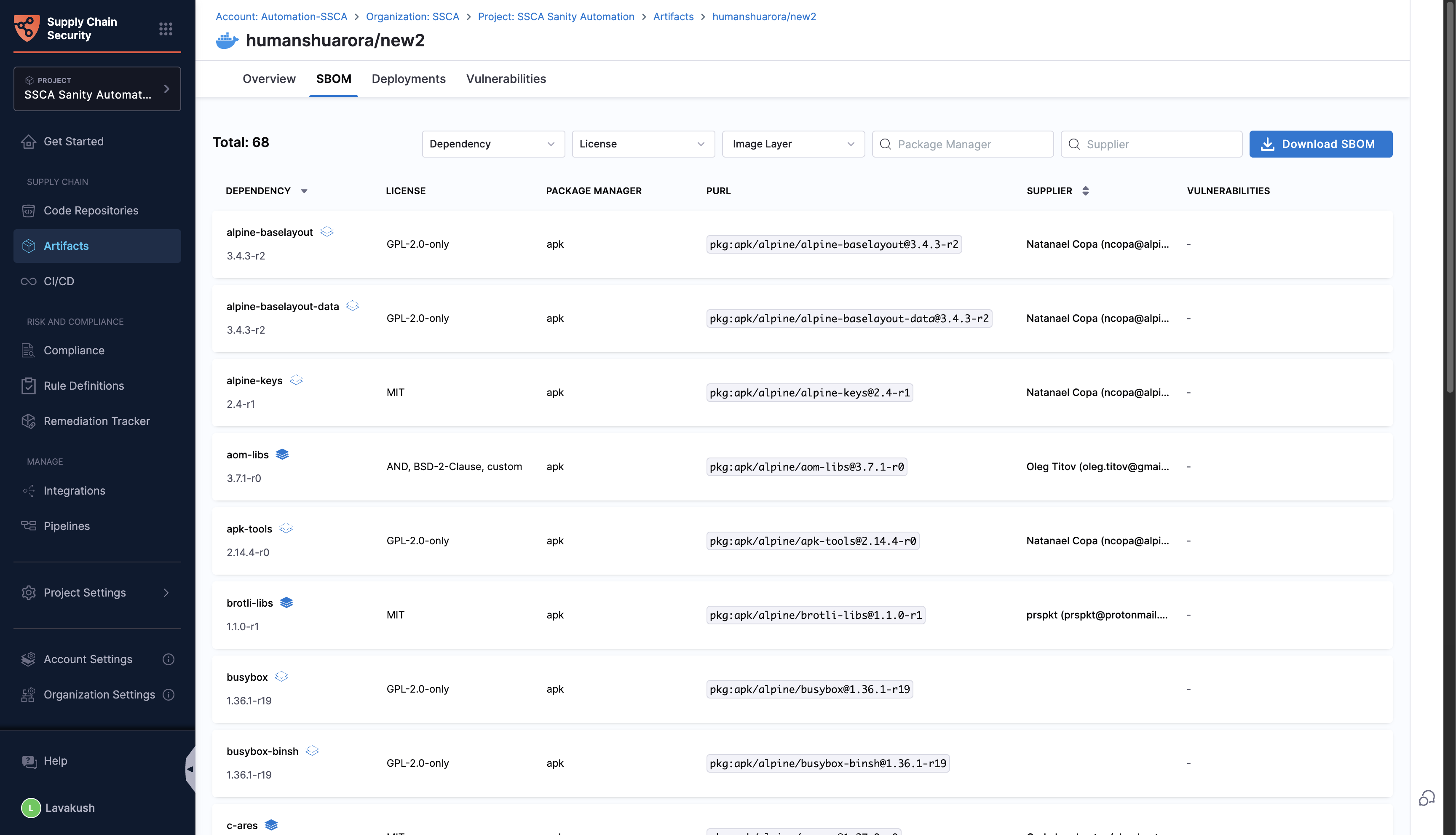- SBOM: Shows the total number of dependencies along with the SBOM score. You can also download the SBOM from here.