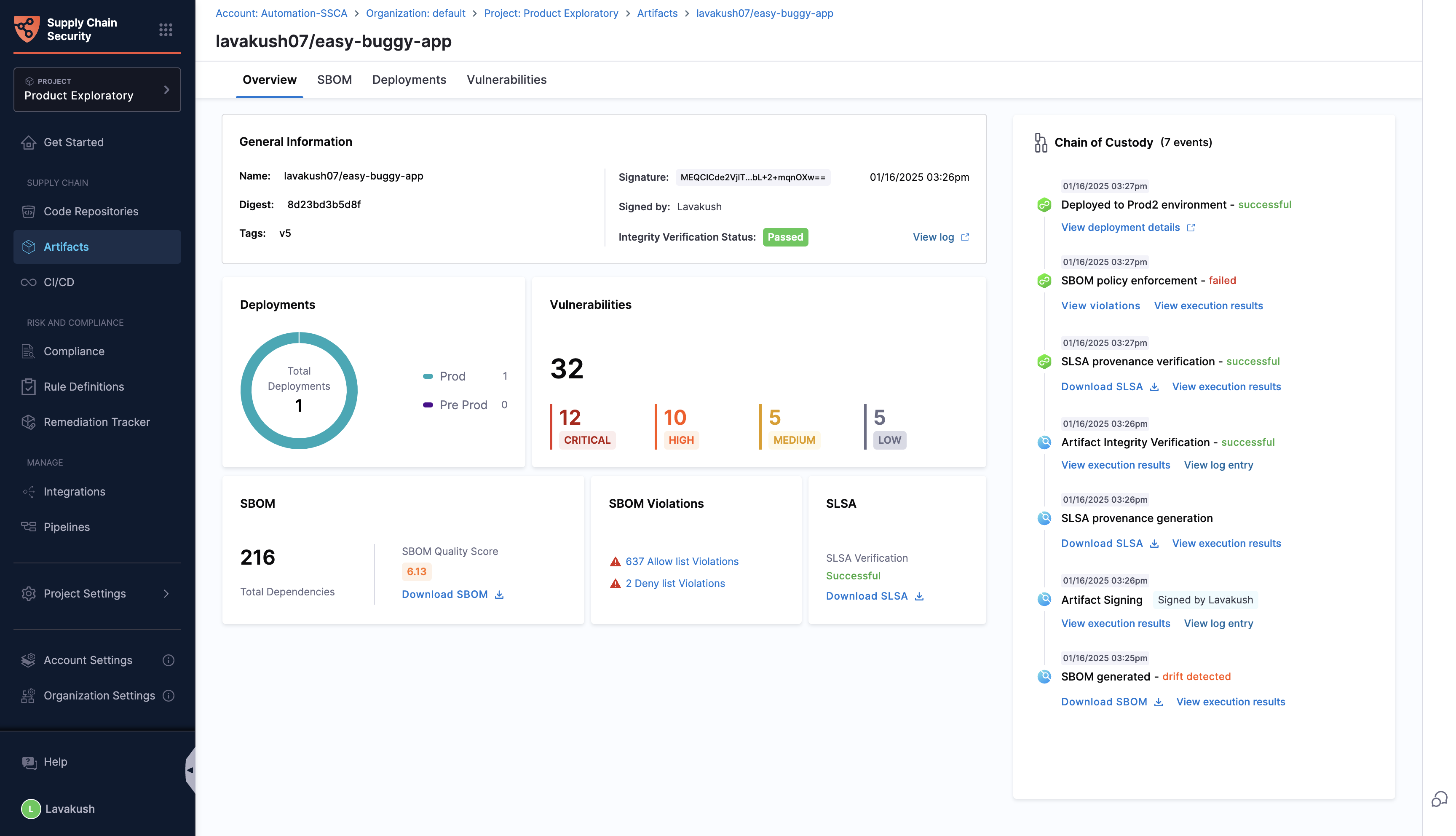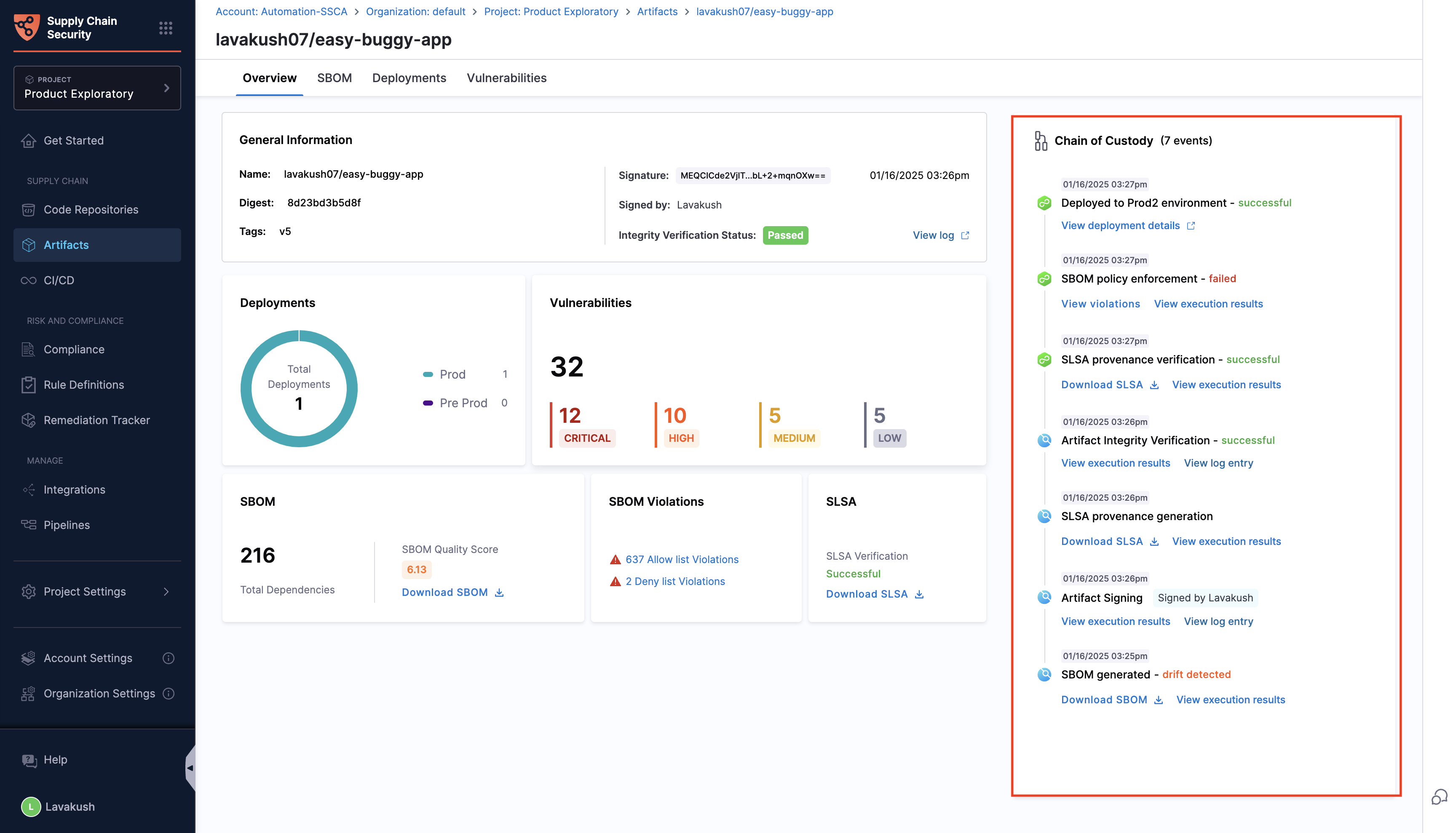 - Chain of Custody: Log the artifact's journey throughout the software supply chain.