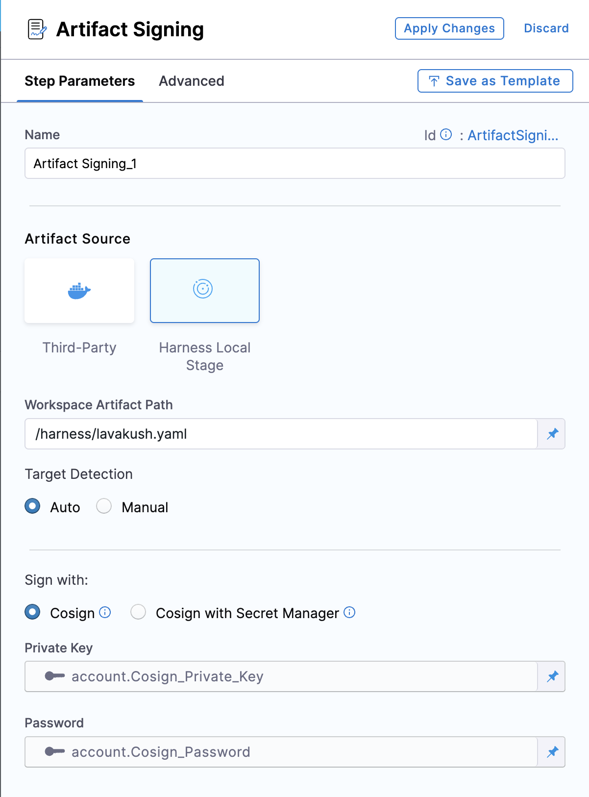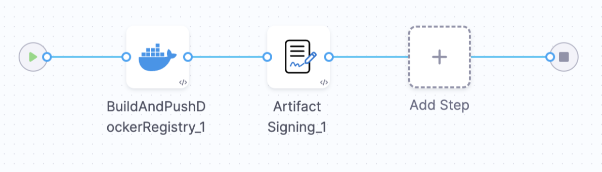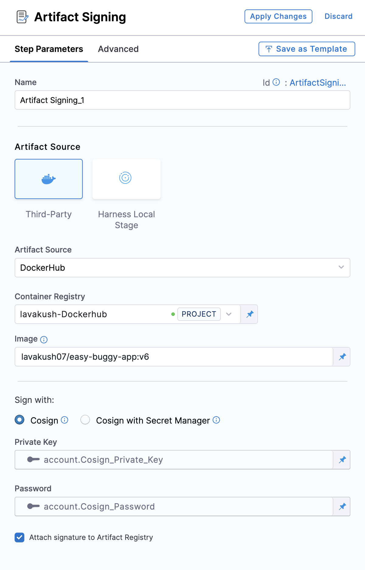 The Artifact Signing step allows you to sign your artifacts and optionally push the generated signature file .sig