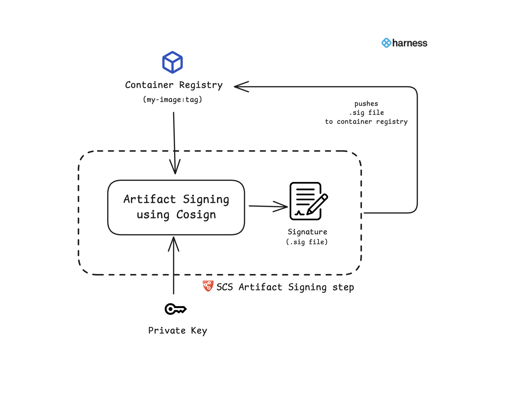 For signing container images, the Artifact Signing step retrieves the artifact from the container registry, signs it using Cosign with a private key from a key pair, and generates a signature file .sig
