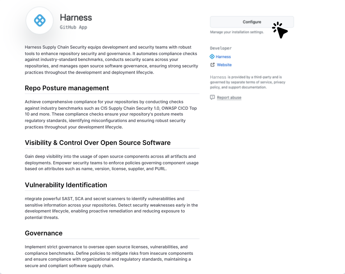 - Visit the Harness-SCS GitHub app and click the ‘Configure’ button.