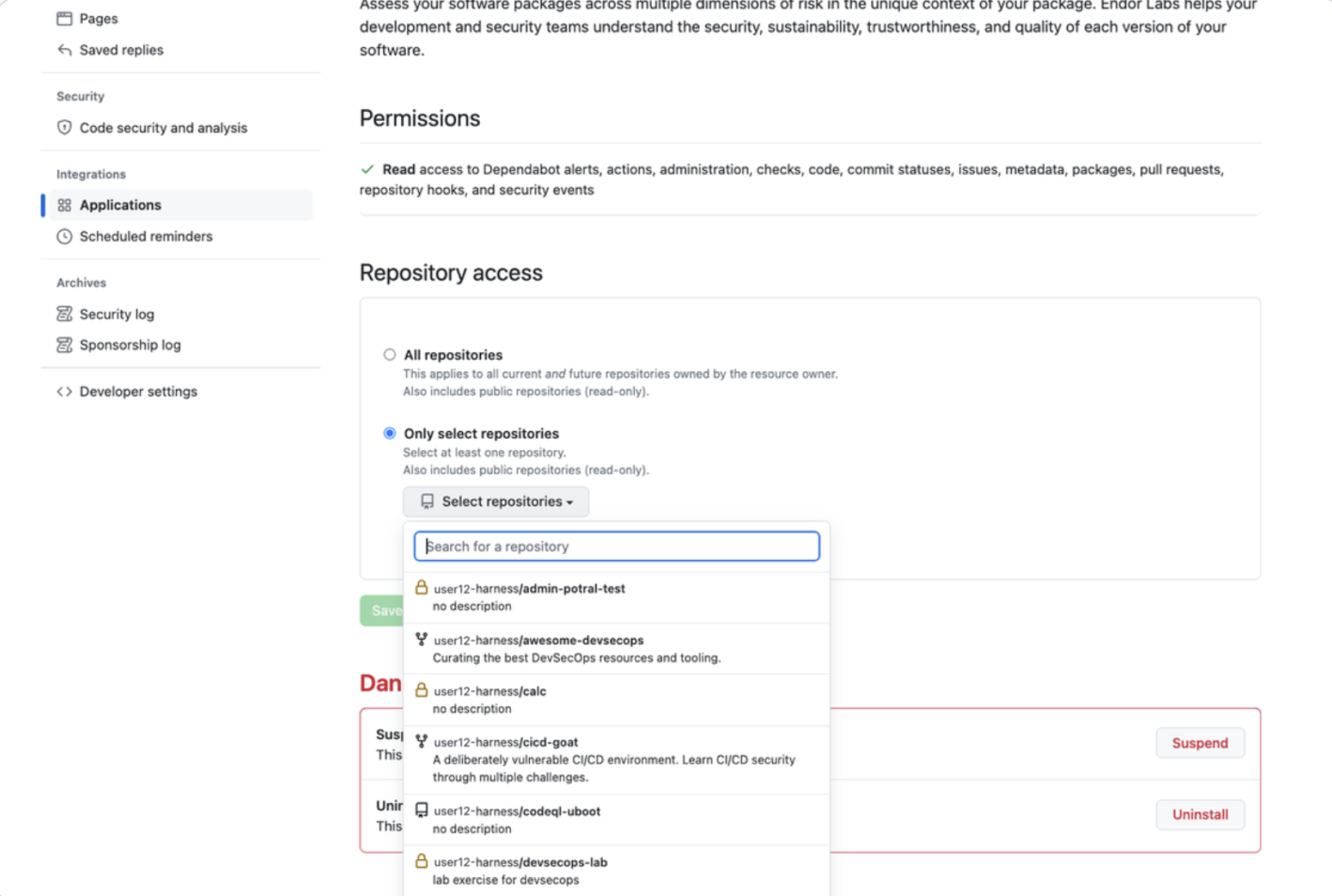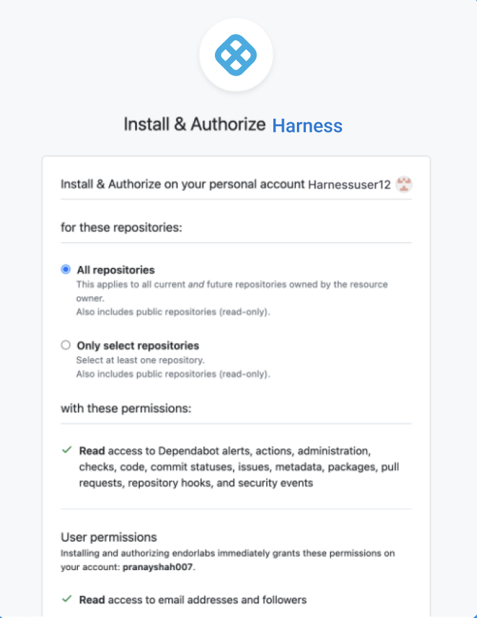 - Grant access to repositories. You can either select all repositories or choose specific ones. By default, Harness performs scans on your repositories every 24 hours.