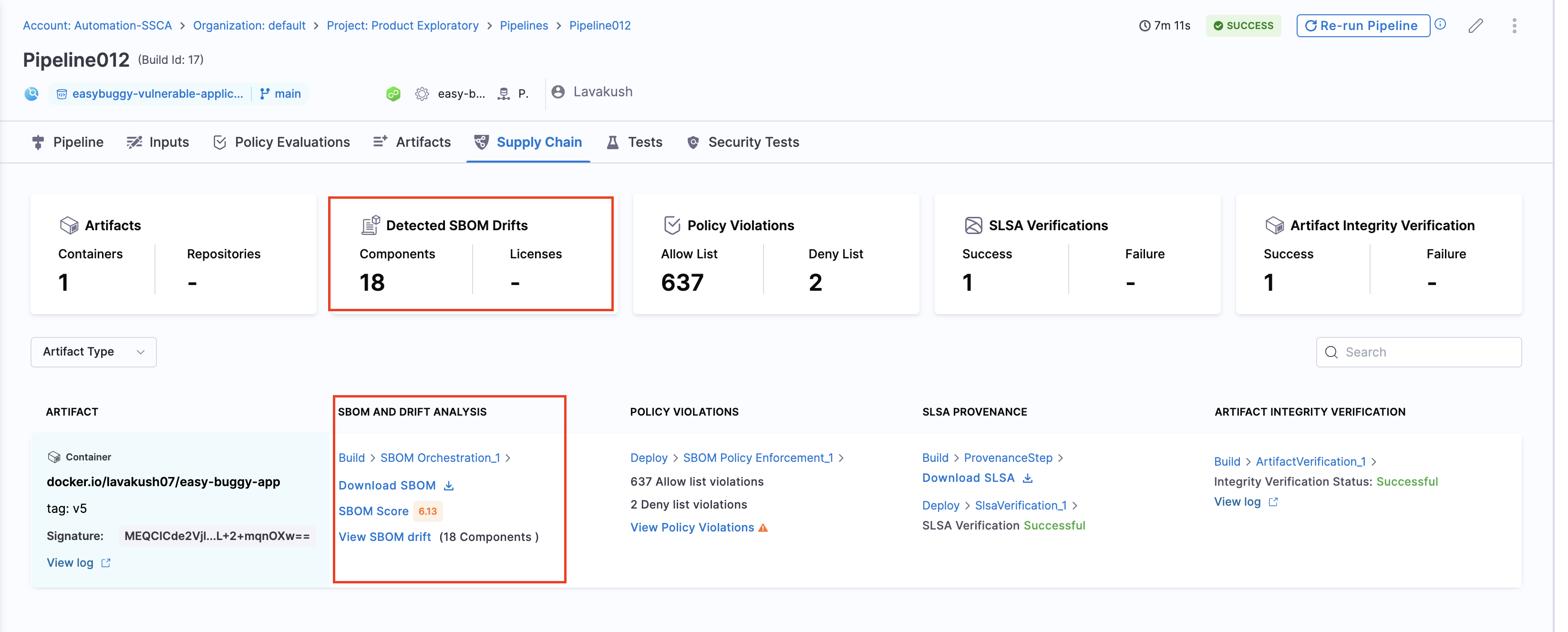 SBOMs for both Containers and Code Repositories are accessible in the Artifacts view. Additionally, you can locate the SBOM for any artifact on the Supply Chain tab within the Execution Details page in Harness.