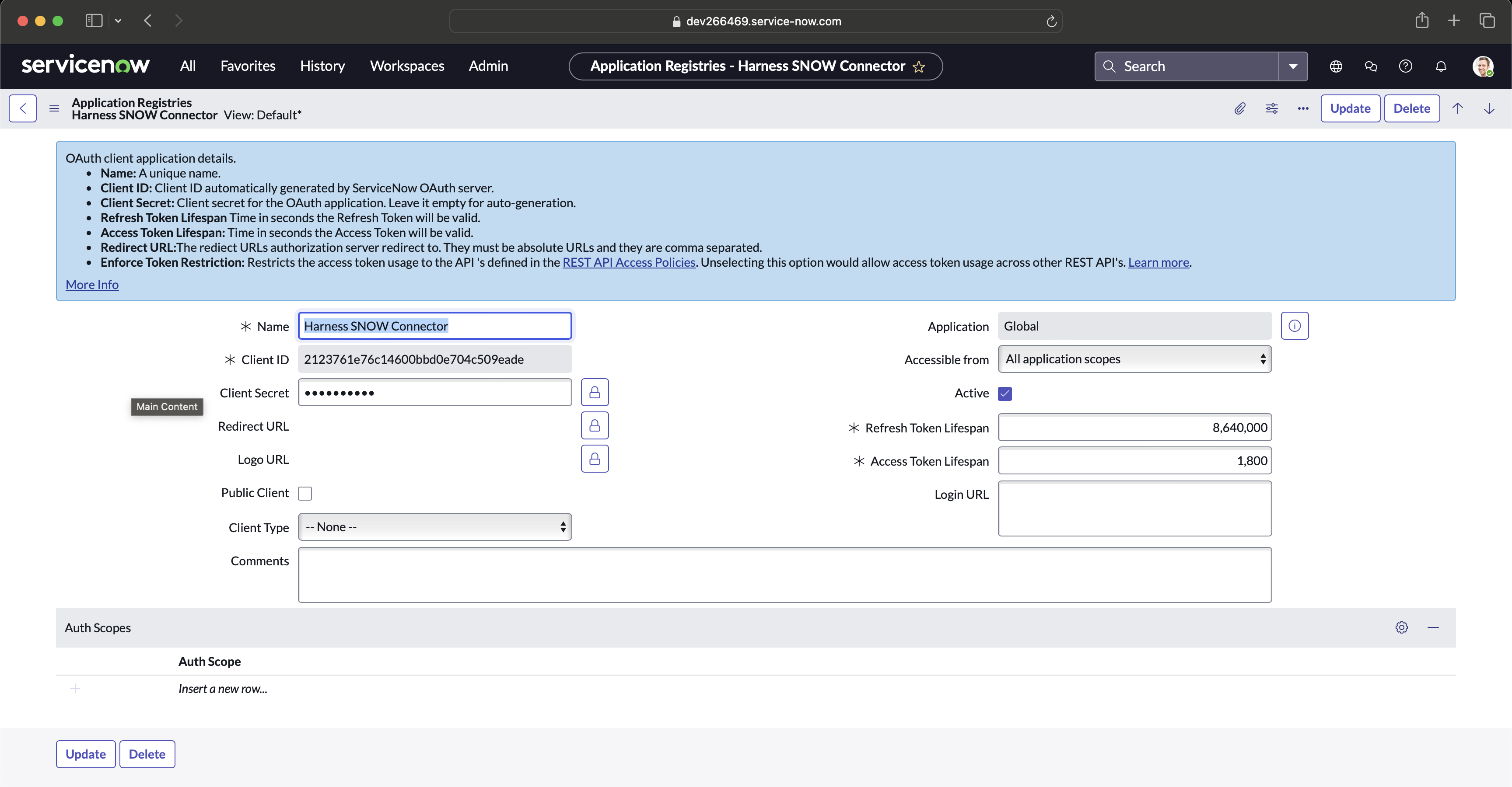 - Once configured, you’ll receive a Client ID, Client Secret, Username, and Password. With these credentials, you can generate the Refresh Token and Access Token. Refresh Token is needed for the ServiceNow (SNOW) Connector in Harness.