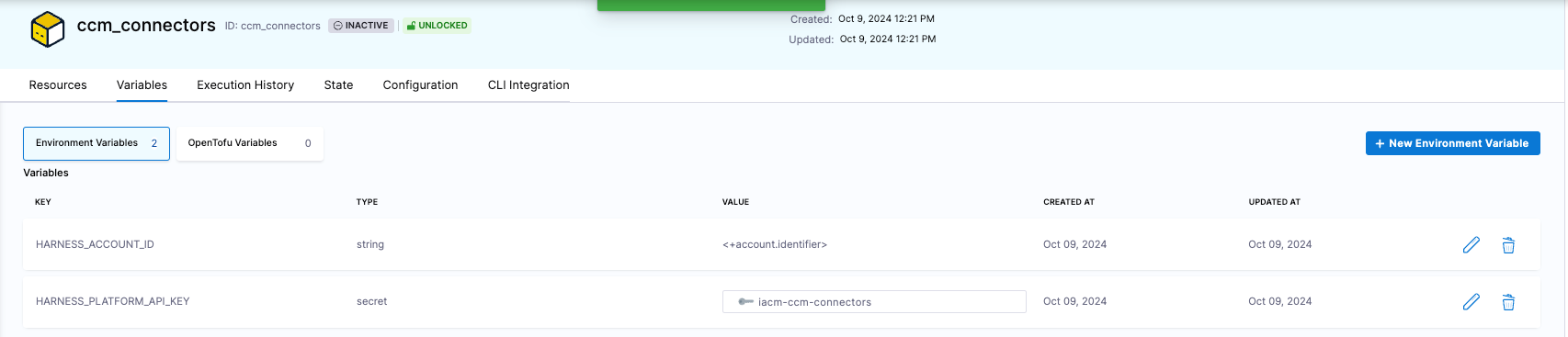 The AWS authentication is handled via the OIDC connector defined above, but Harness authentication still needs to be configured. To define the Harness authentication, we need to define two environment variables: Harness account id and Harness platform API key.