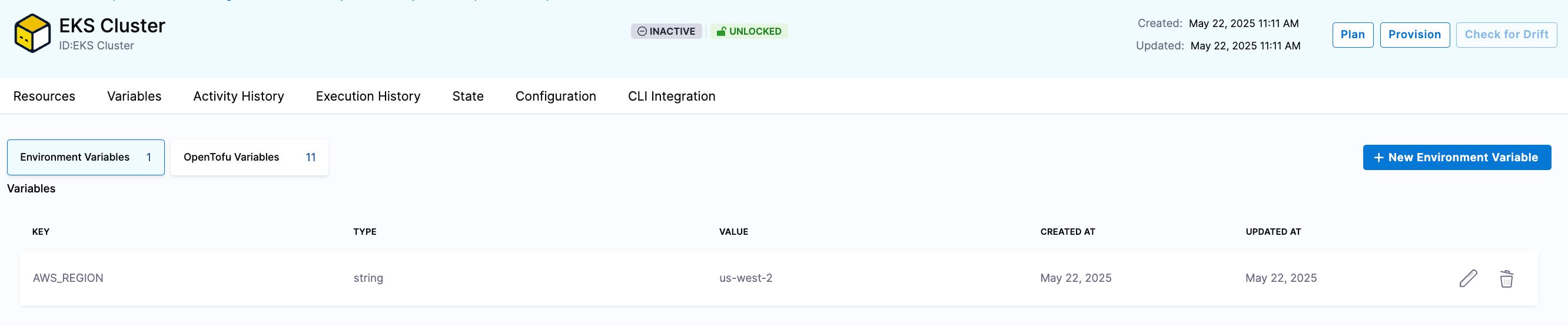 A workspace in IaCM represents the Terraform code you want to provision and a single "state" or instantiation of the code. We will create a workspace that points to the AWS EKS Module source as our code, uses the AWS connector we created for access to provision, and finally some variables to actually customize the EKS cluster being deployed.
